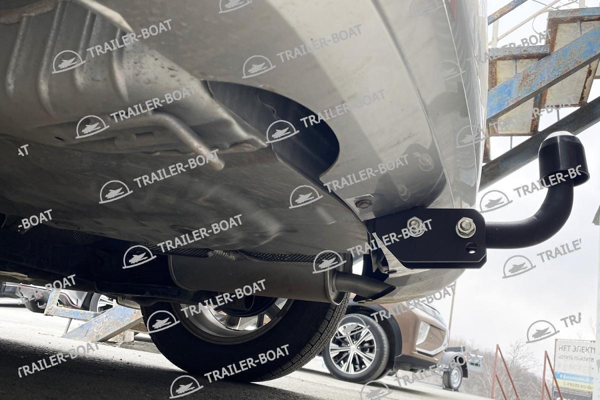 Снять бампер, демонтировать демпферы с двух сторон. Опустить глушитель. Завести фаркоп внутрь лонжеронов, закрепить болтами через штатные отверстия. Подрезать бампер по месту.