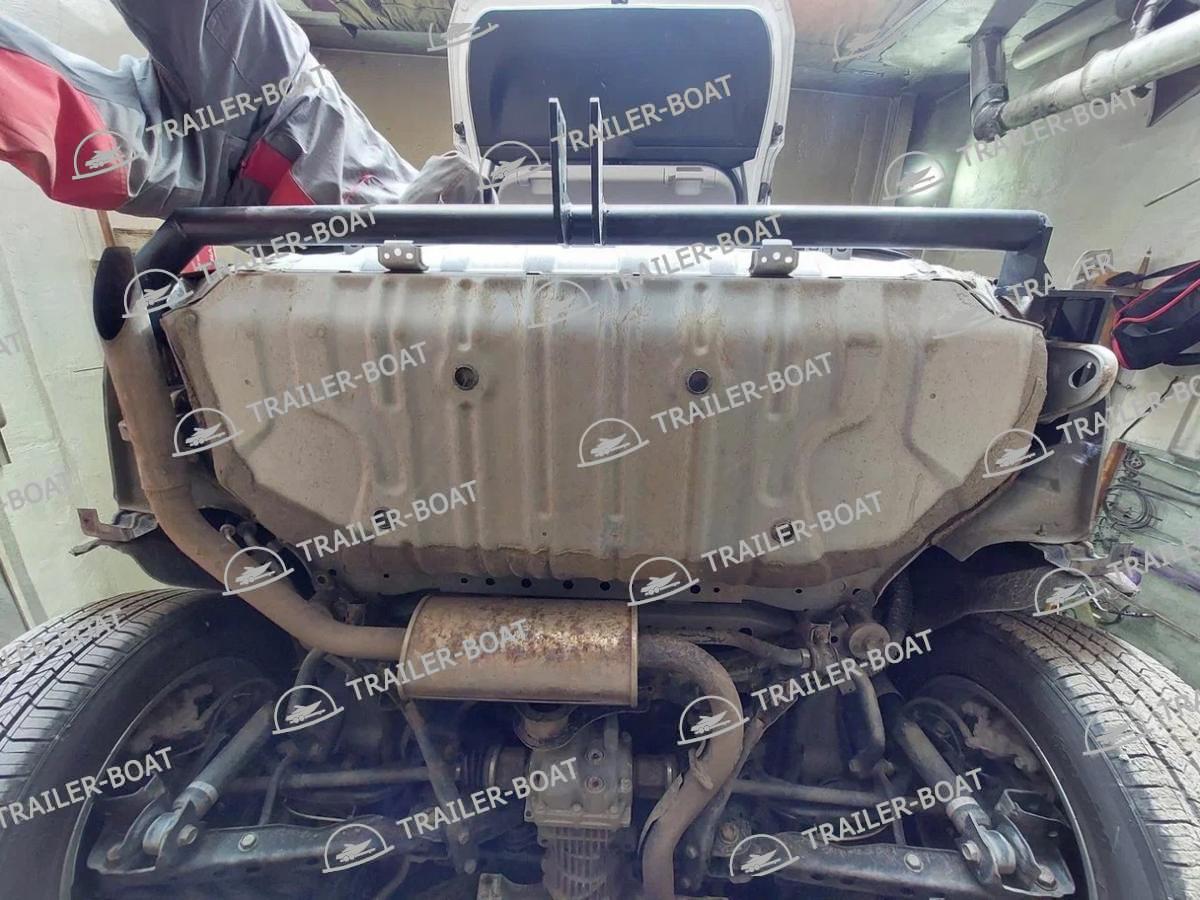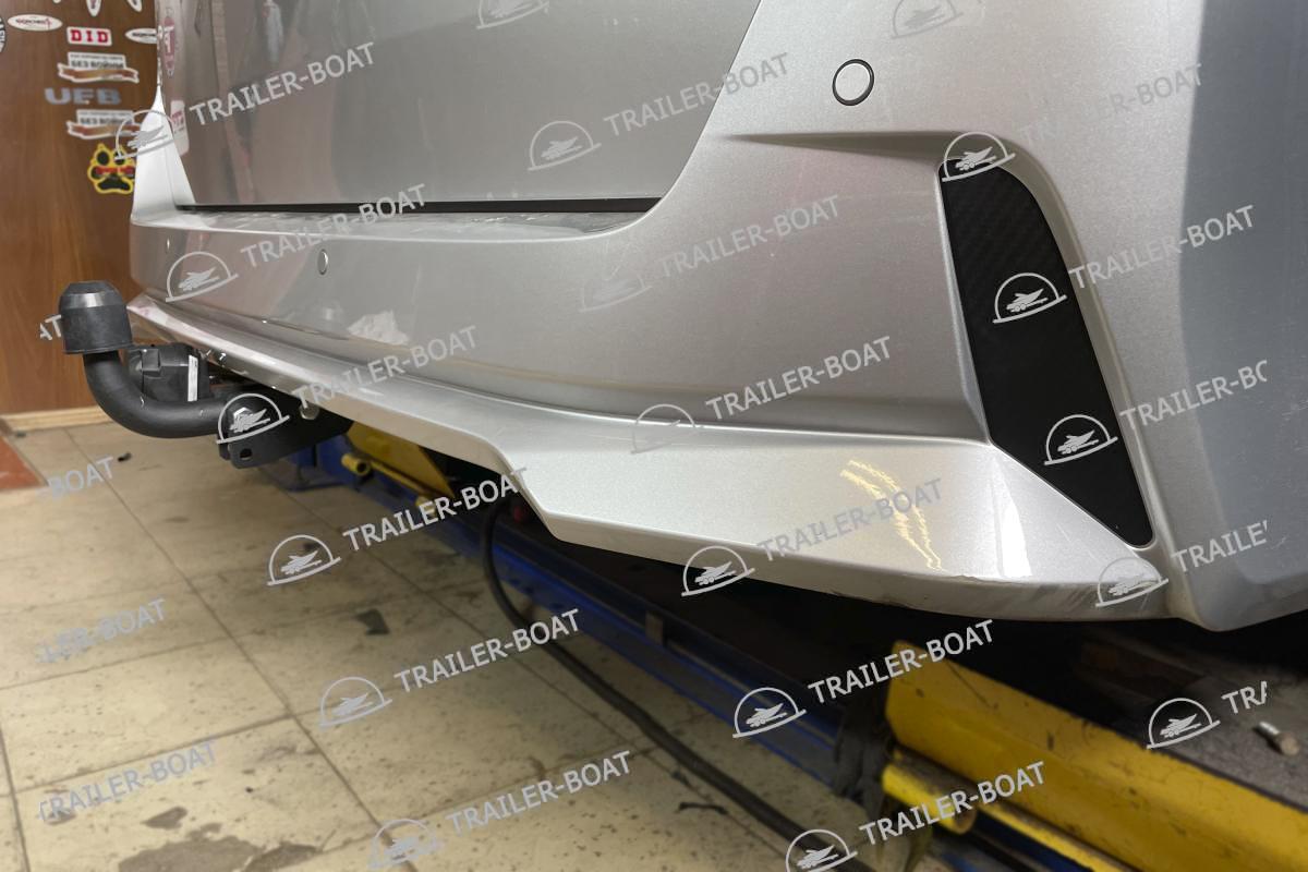 Для установки требуется снять бампер и обшивку боковин багажника. Досверлить насквозь четыре заводских отверстия. Установить фаркоп используя закладные втулки. Втулки подрезать по месту. Подрезать бампер.